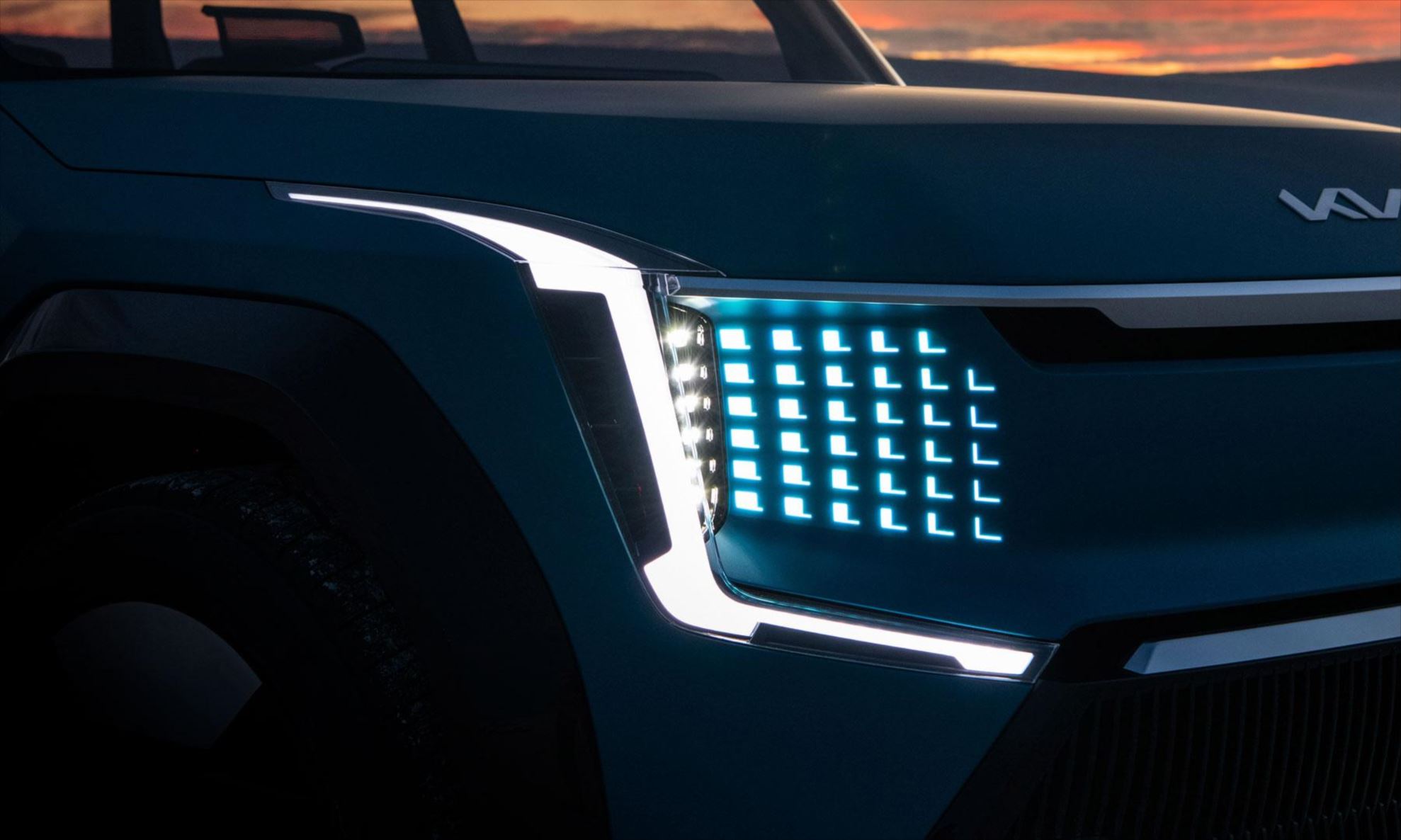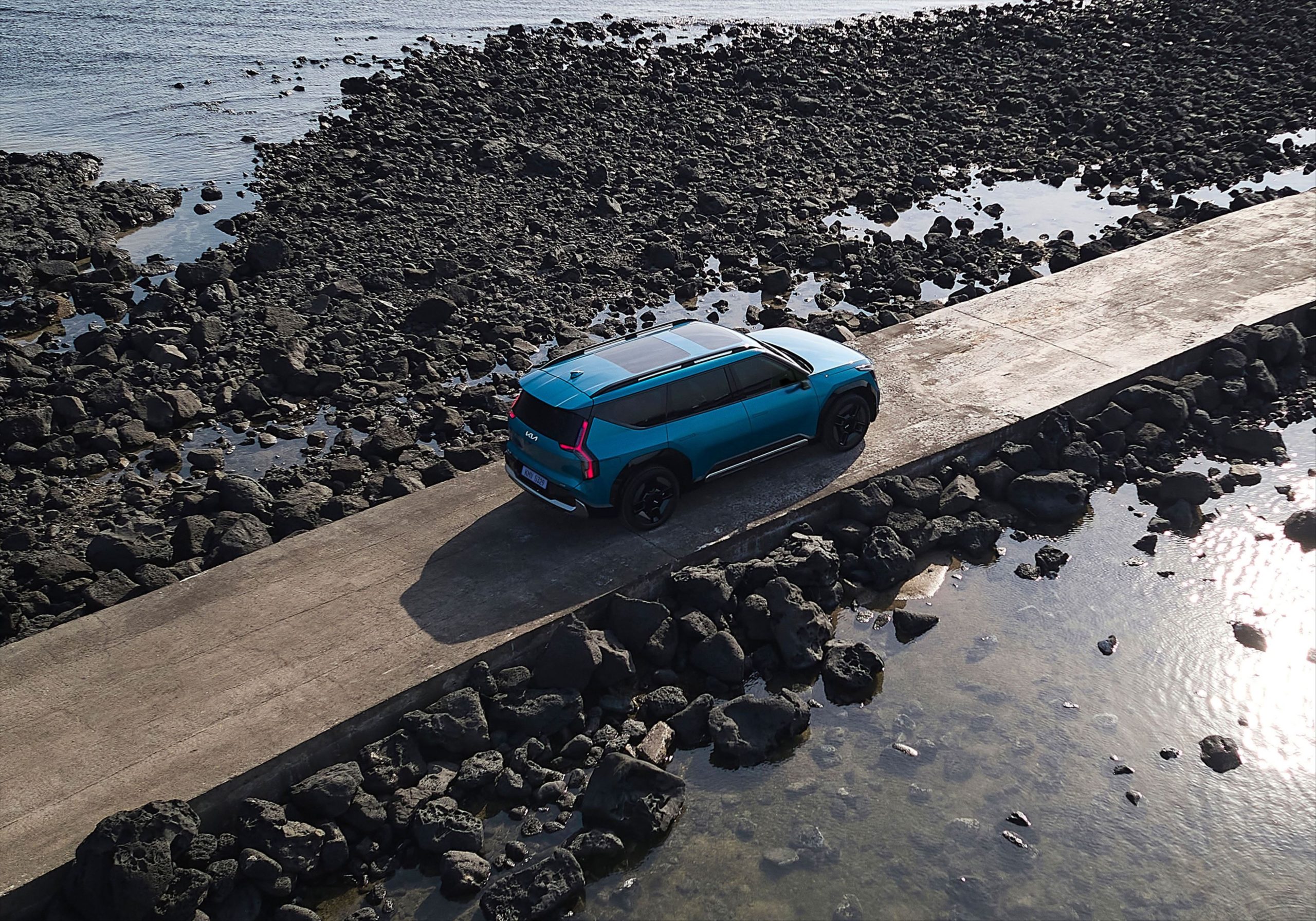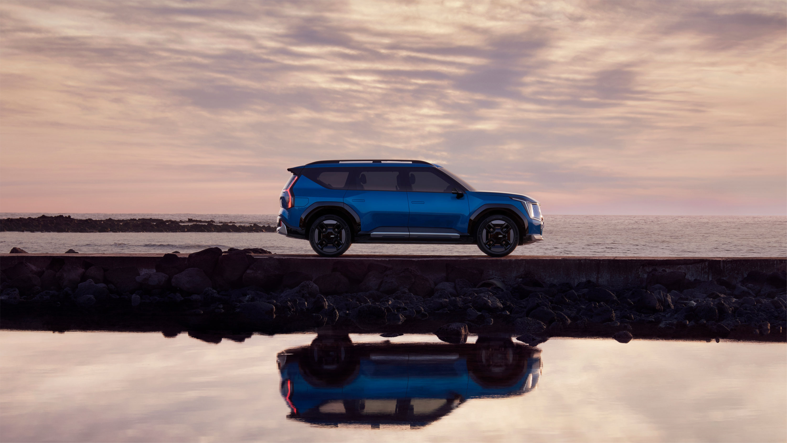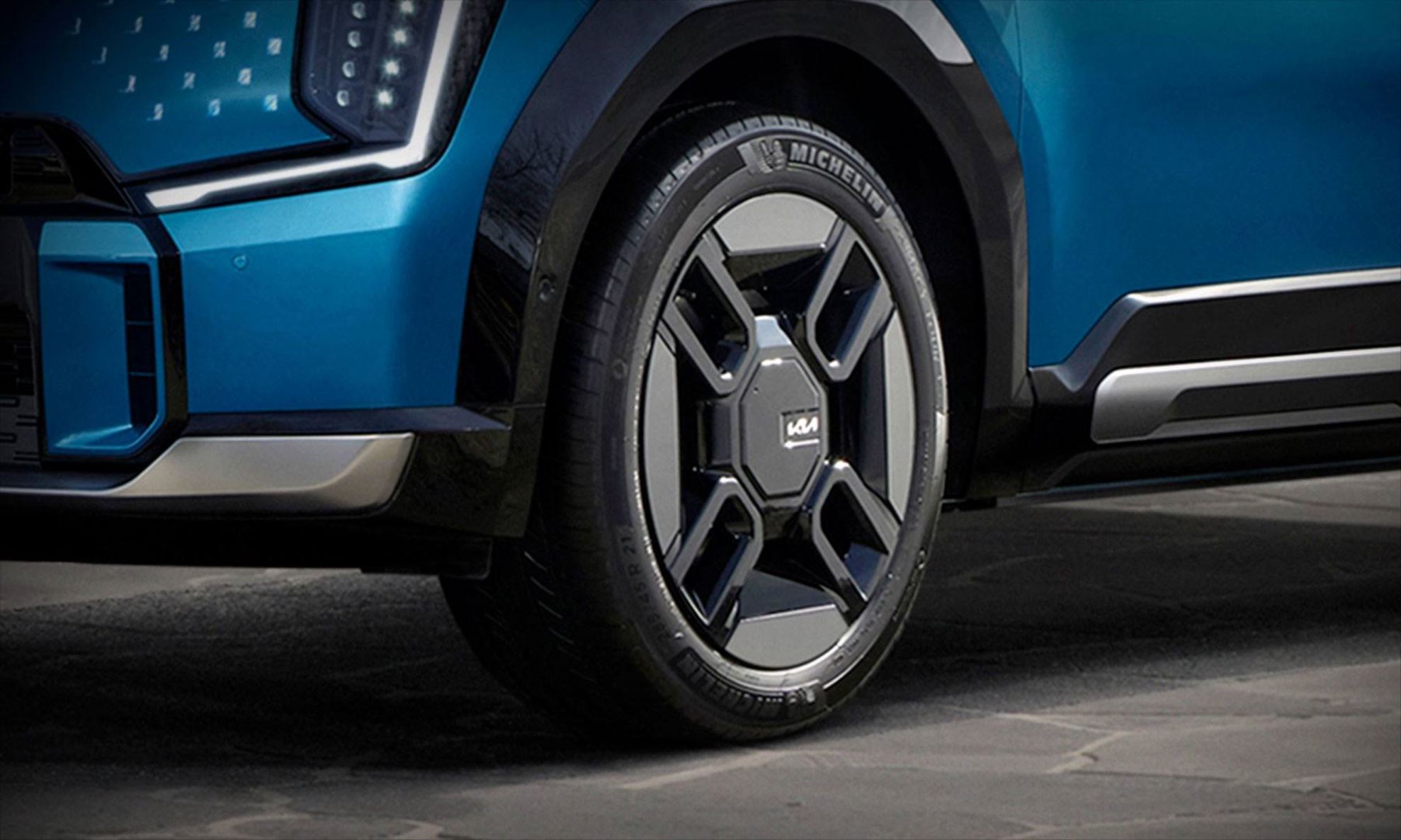 As rodas de liga leve aro 21″ com acabamento em black piano e prata escurecido complementam o design ousado do Kia EV9.