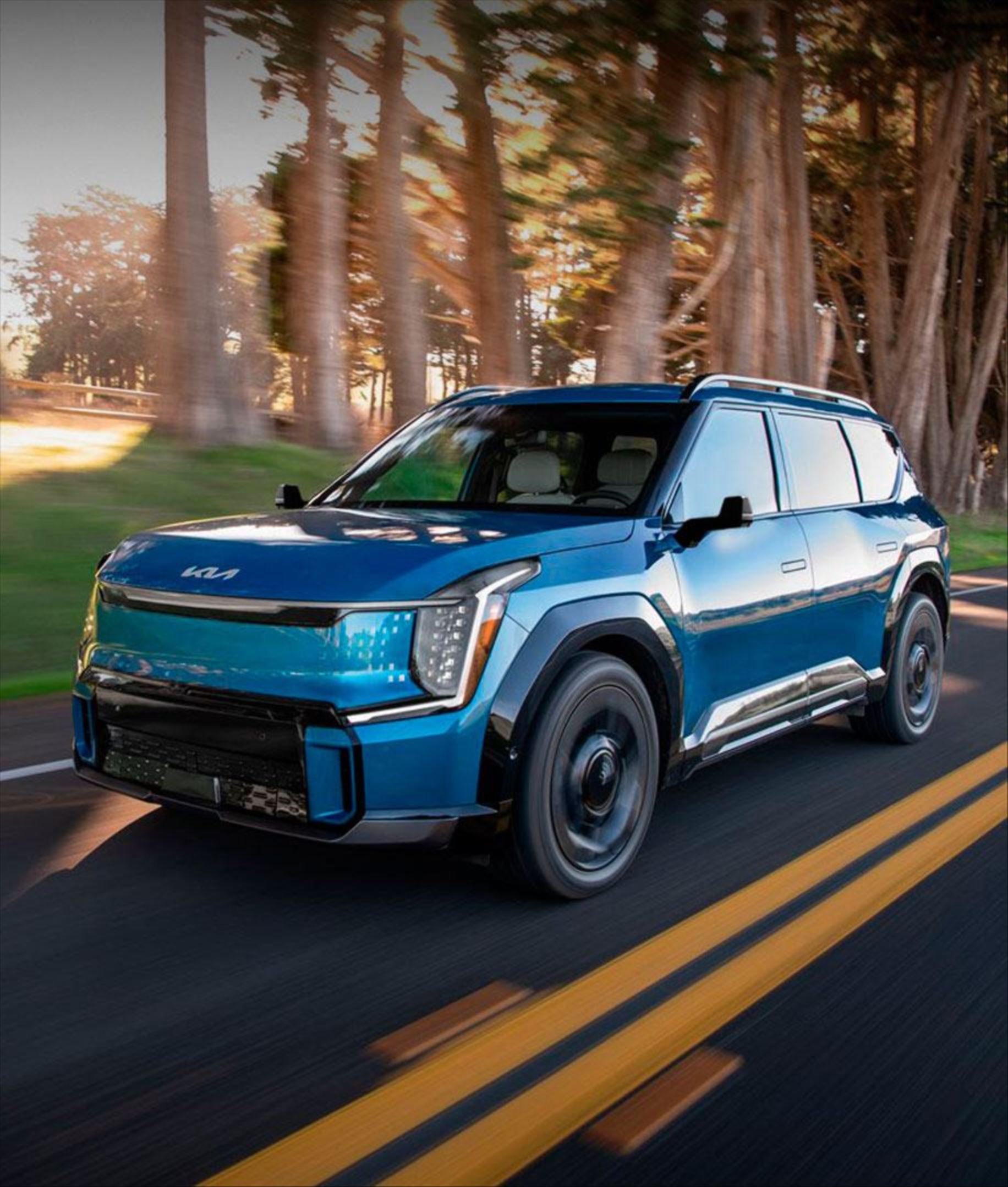 O Kia EV9 oferece teto solar duplo panorâmico, com acionamento elétrico, proporcionando uma experiência relaxante a todos os ocupantes do veículo.