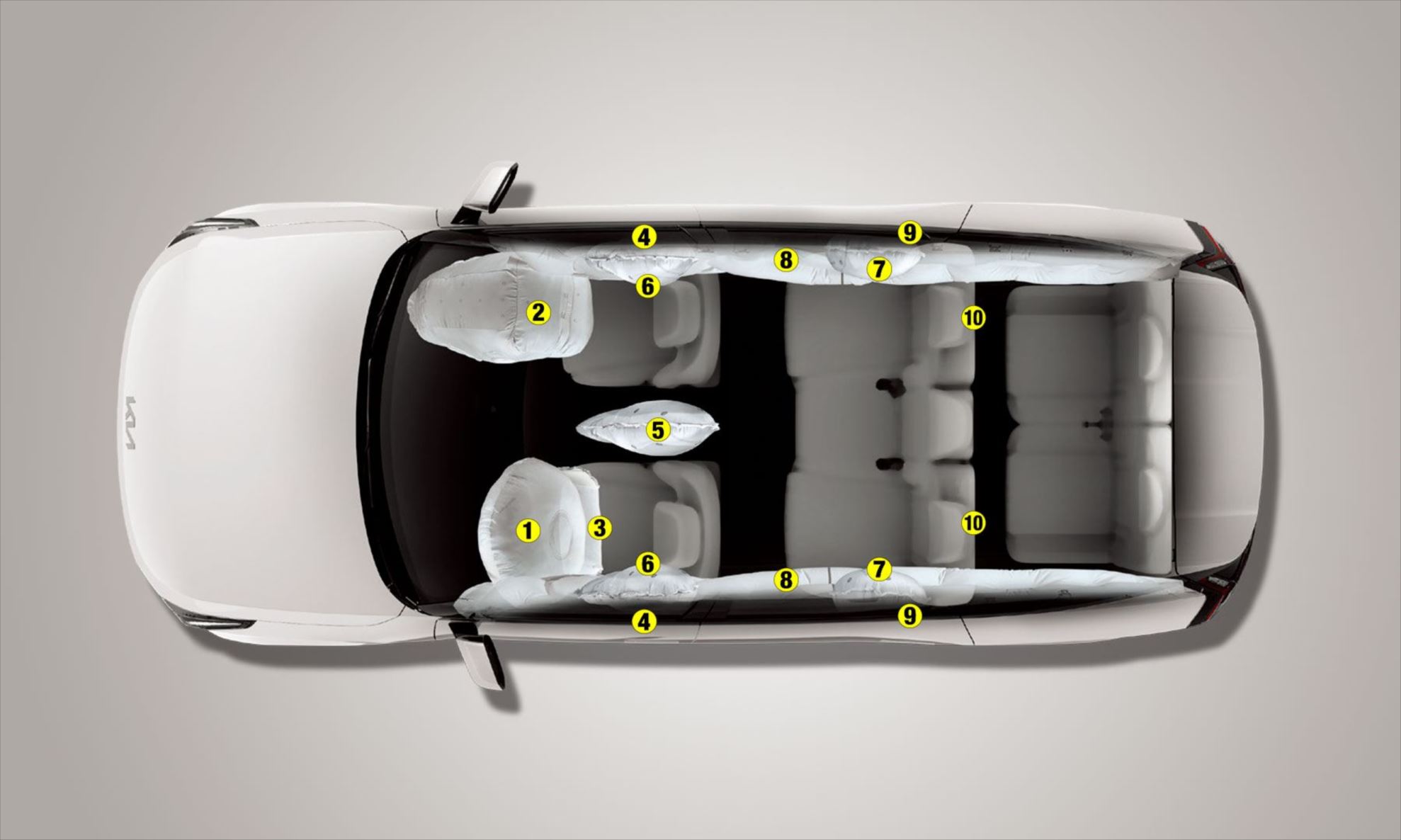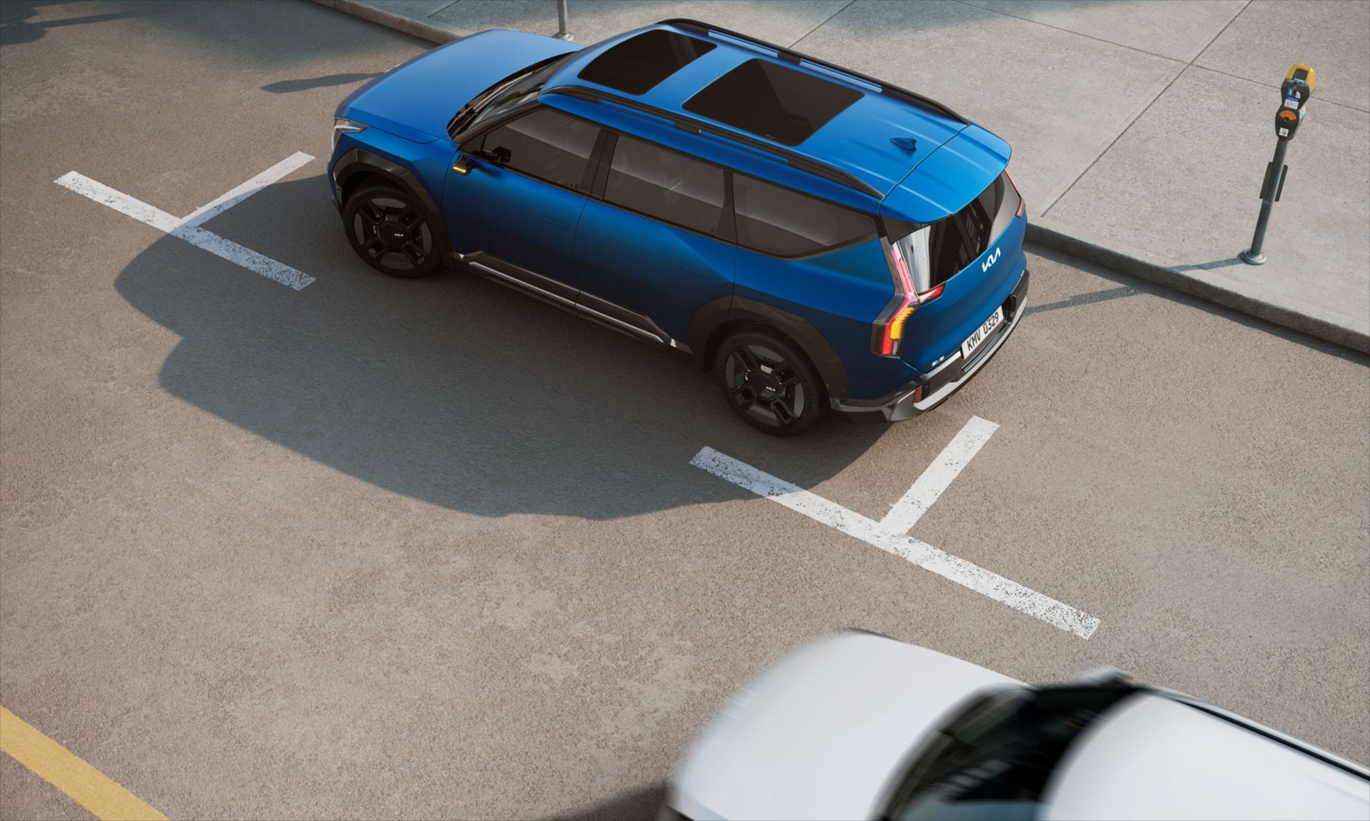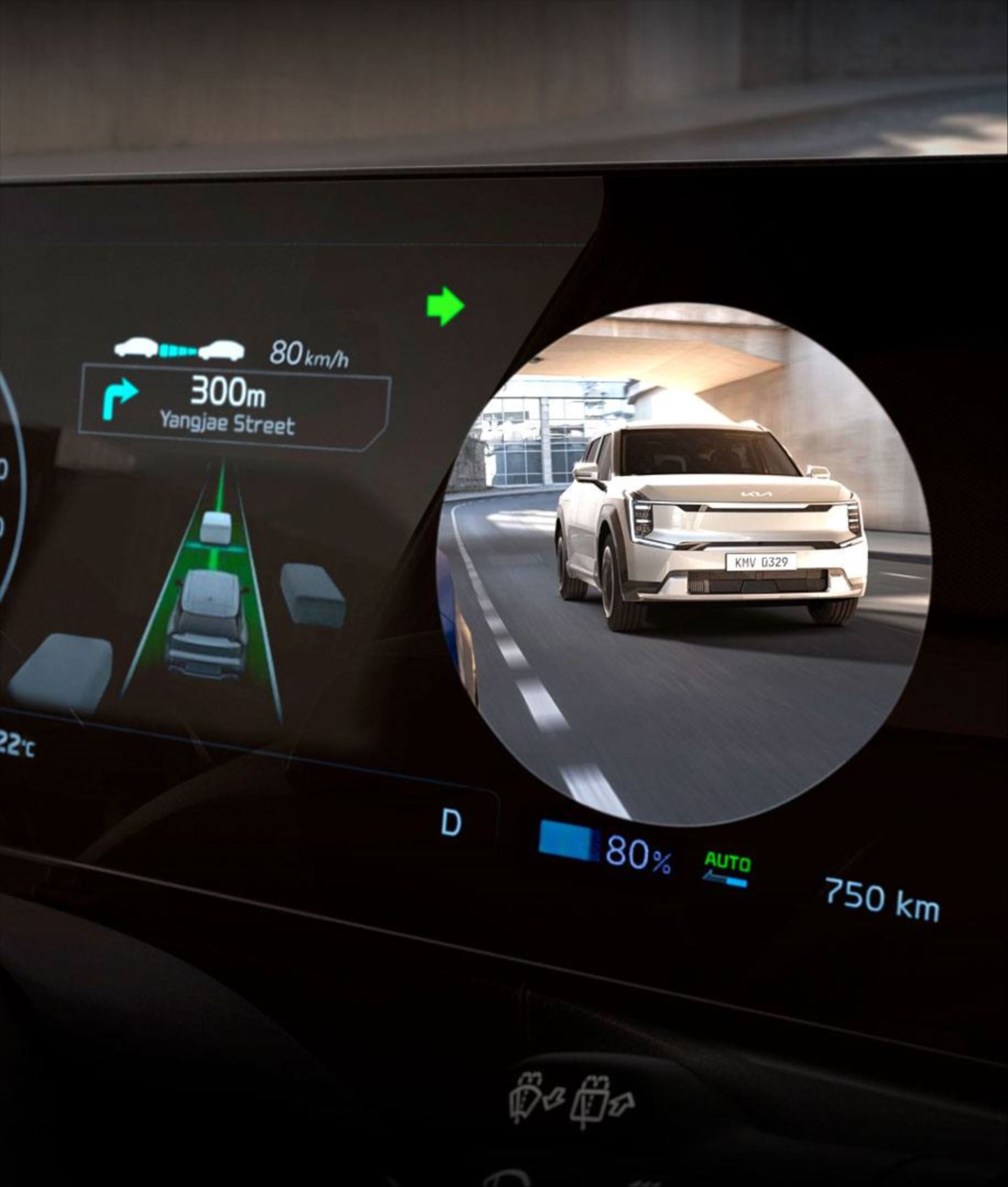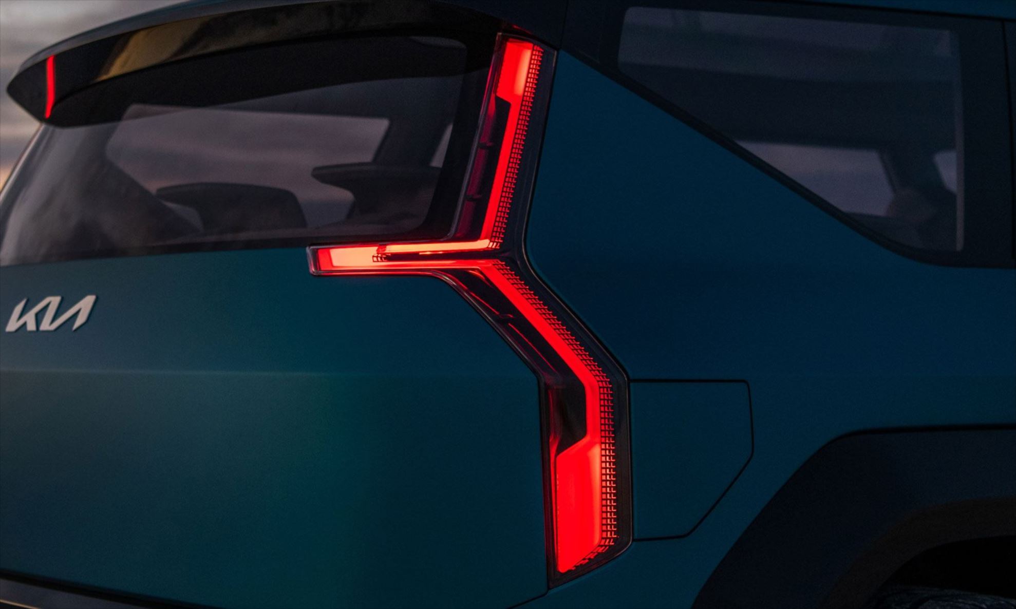 O sistema usa os radares posicionados no para-choque traseiro para detectar veículos se aproximando por trás e alerta os passageiros antes de saírem do Kia EV9.