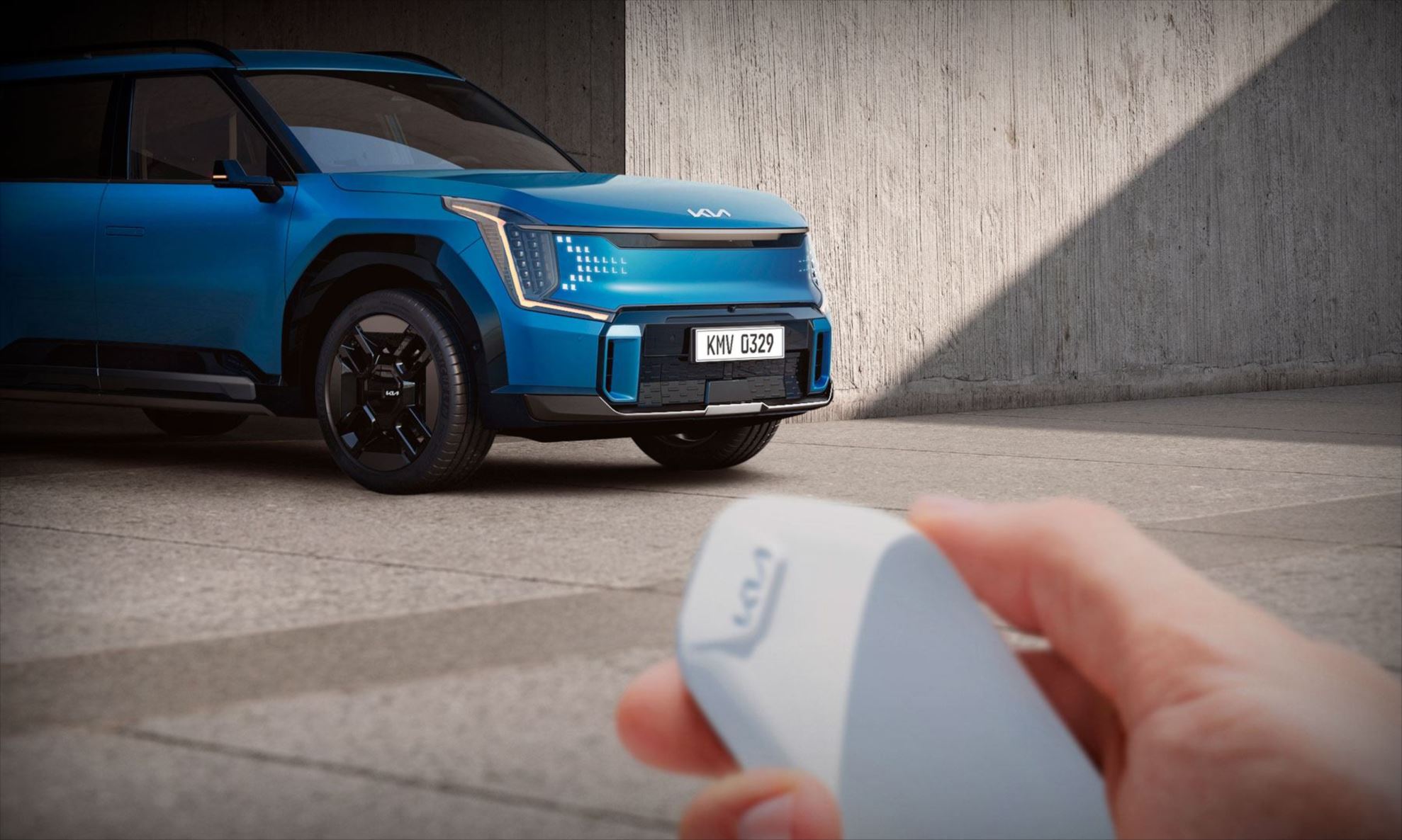 A chave inteligente (Smart Key) possibilita diversas conveniências, entre elas, a partida remota do motor do Kia EV9.