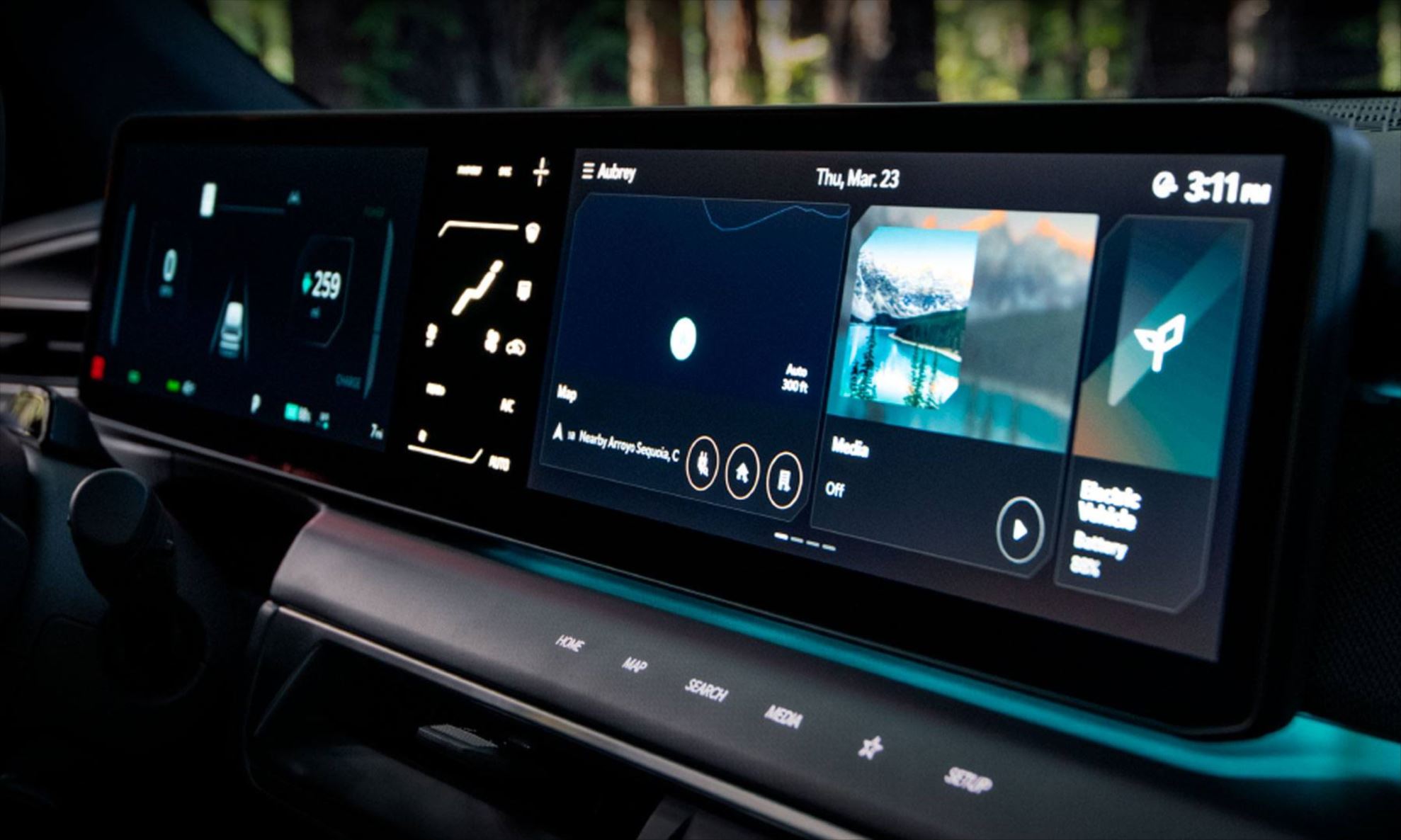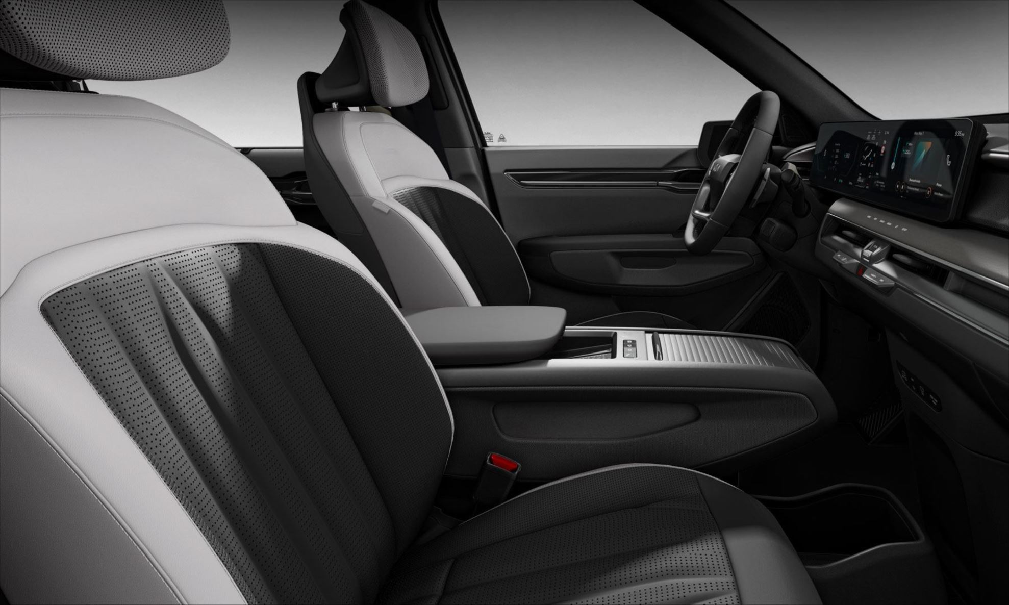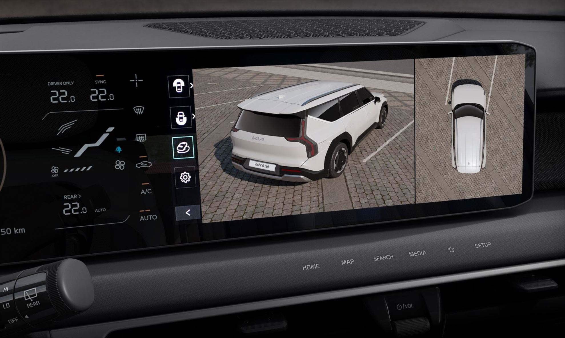 Os retrovisores externos digitais por câmera do Kia EV9 projetam as imagens ao redor do veículo em telas de 7 polegadas OLED, localizadas nas extremidades internas das portas dianteiras.