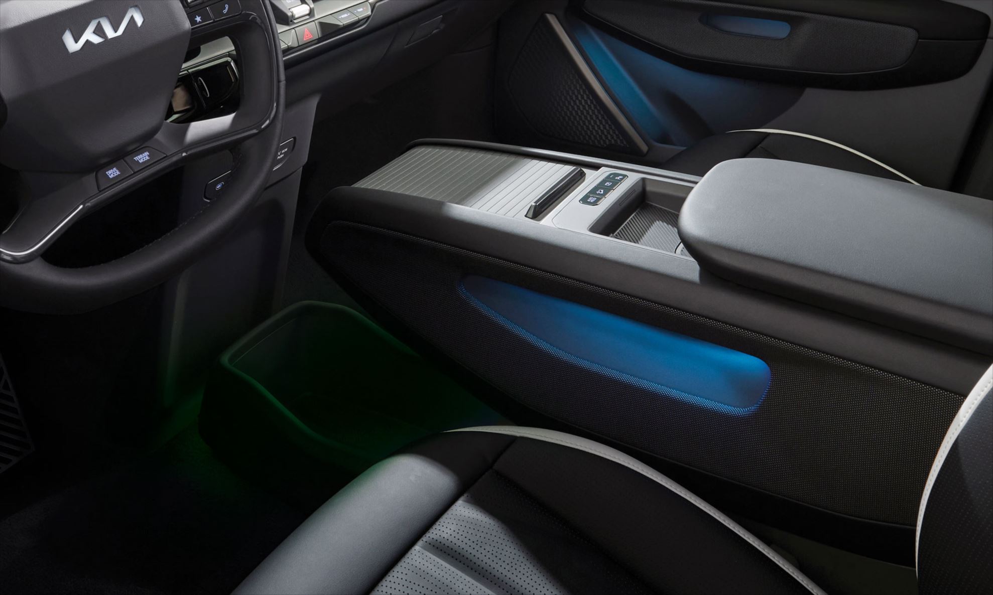 Para proporcionar um ambiente diferenciado e adaptado ao gosto dos ocupantes, o Kia EV9 oferece uma iluminação interna em duas zonas com 64 opções de cores para combinações diferentes.